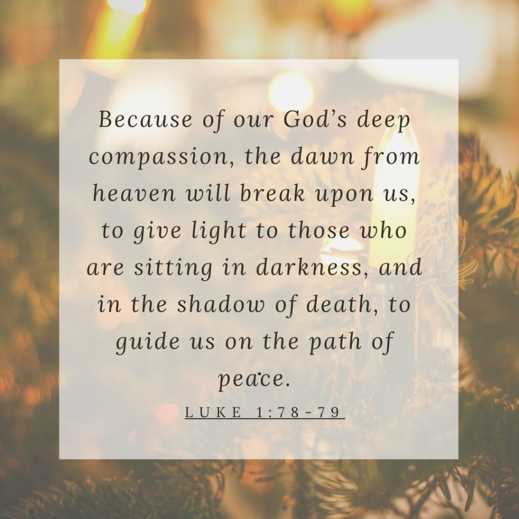 I love the imagery in the above verse…the idea of God’s compassion breaking over us like the dawn. The light reveals all things. What we thought was a marauder lurking outside of our house turns out to be a bush. God’s light illuminates everything around us, allowing us to see things clearly. We gain new understanding, new perspective. We feel more confident and (maybe) less afraid. The light allows us to get our bearings…to find our path…to get our footing. Everything is easier when there is light to show us the way. And God gives us this gift because of his compassion…because he loves us and wants to enter into our lives. How beautiful is that gift!? Everything else pales in comparison to the fact that God loves us so much he comes into our lives, every day, to walk beside us as we journey. So what do we do with such a gift? Like the prophet John, we are called to be Christ’s messengers of peace. We have been appointed to give light to those sitting in darkness and to guide others on the path to peace.
