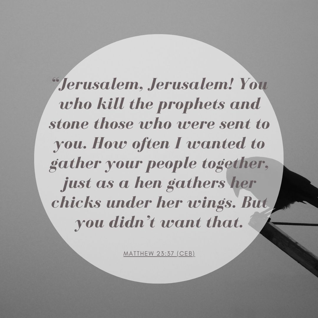 As I sit here this morning, a day after a gunman walked into a supermarket and killed 10 people…a week after another gunman walked into three business and killed eight people…and probably just hours after countless others in our nation have been killed by gun violence, I find myself wondering, yet again, why human beings have such a capacity for destruction. Why are we so prone to inflicting harm, both on ourselves and others? I recall Jesus’ words, as he stood above Jerusalem and wept for the errant city of God.