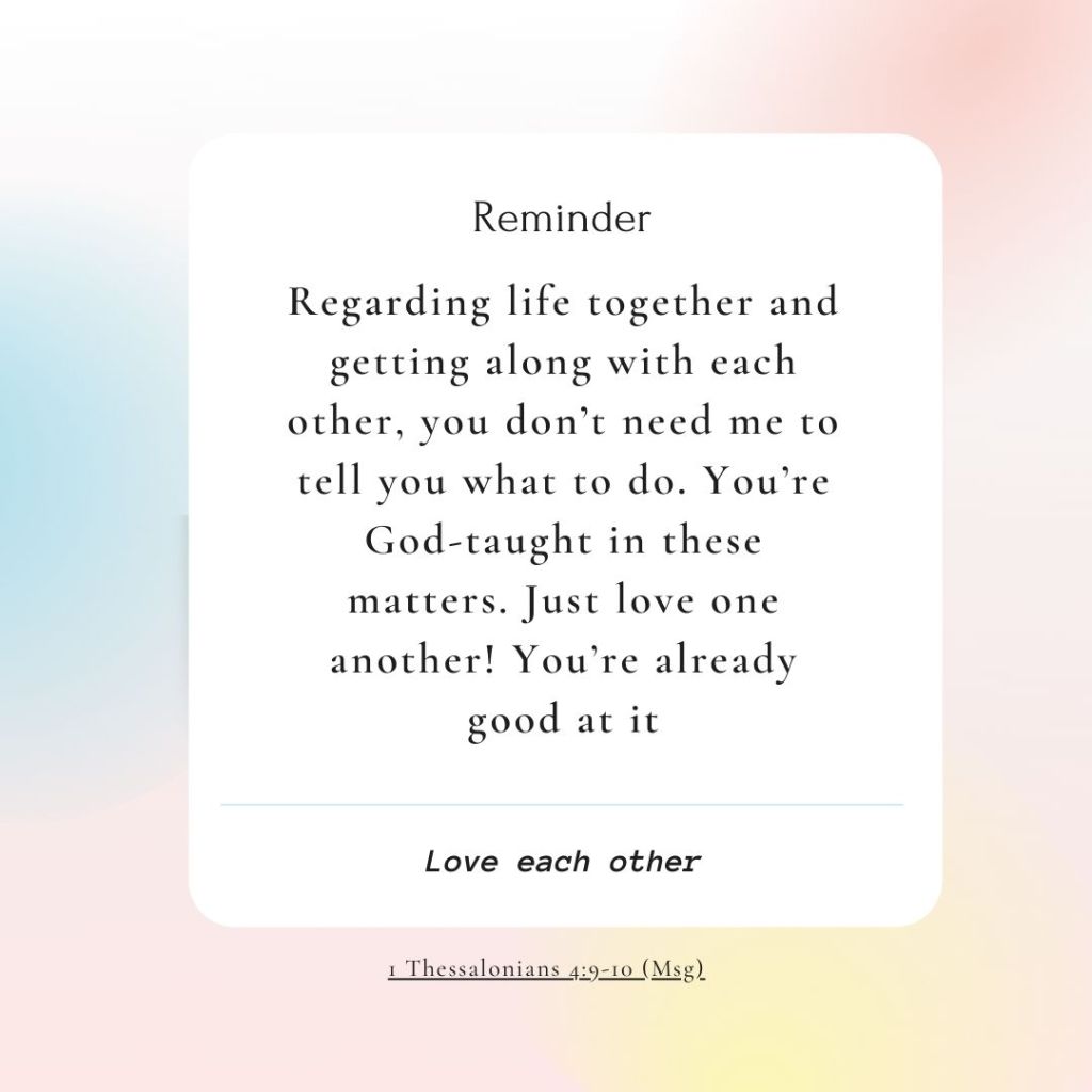 Just love one another! I love this passage from The Message. Paul is giving the Thessalonians a reminder. They don’t need Paul to give them any more theology. They already know what to do. It’s what Jesus told his disciples in John 13. It’s the same thing Jesus told the crowds in Matthew 22. We know what we need to do…and Paul reminds us that we’re already good at it! If we have the love of Jesus in our hearts (way down in our hearts…remember the song?) we can’t help but love other people.