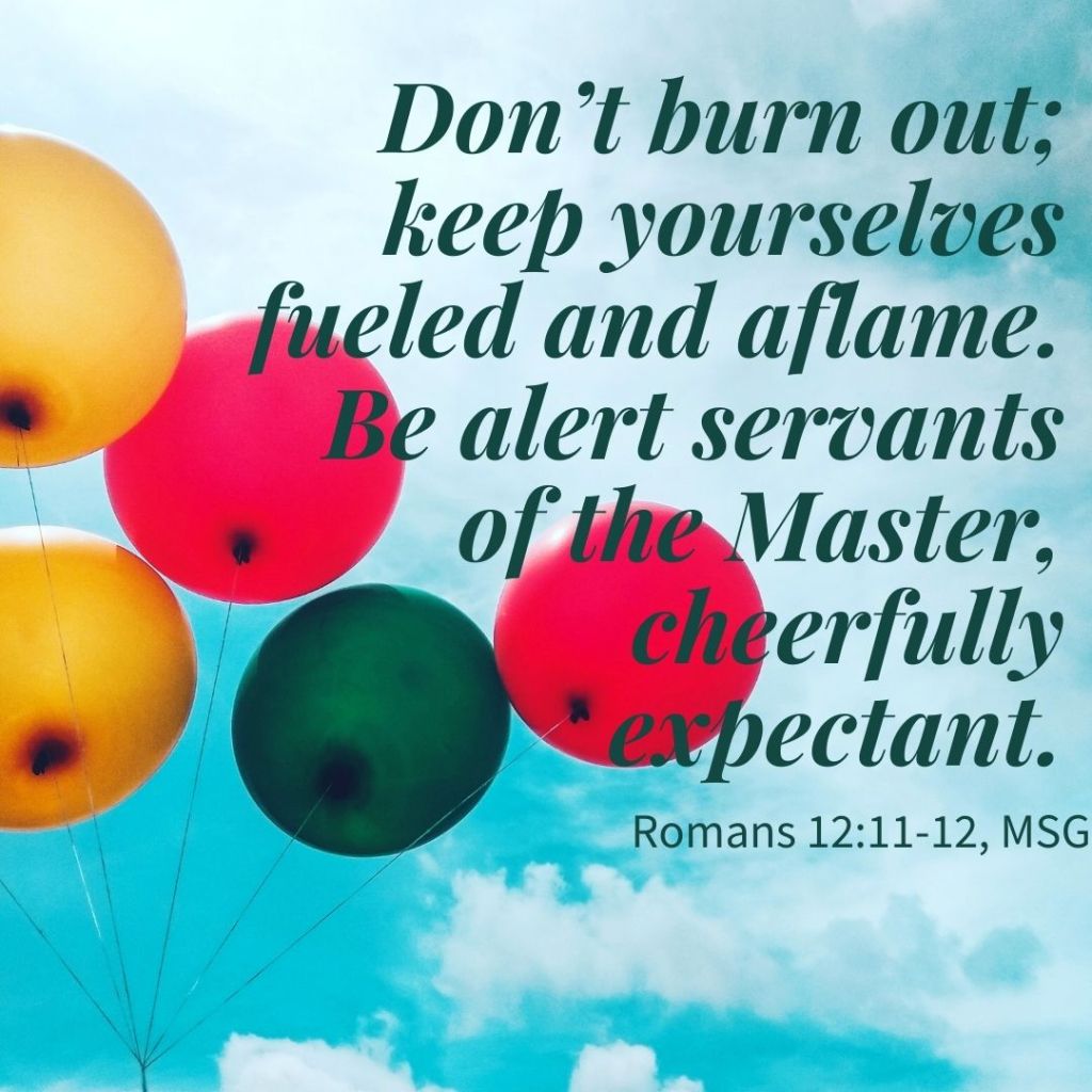 I love the dichotomy here between being burned out and keeping ourselves fueled and aflame. Sometimes, in our quest to keep busy, we douse the flames of our faith. We get so run down, even in service to God, that our flame goes out. But Paul tells the early church members to be alert–to be on guard for burnout and to do those things that add fuel to our spiritual fire. And with this we are to remain cheerfully expectant. It’s interesting that the word which comes before expectant is cheerfully. What does that even look like?
