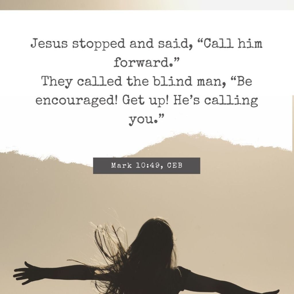 I love this! Tall about cheerful expectation!! The disciples called to the blind man–they didn’t whisper, they didn’t lean down and murmur, they called (i.e. spoke loudly) to him. The disciples were excited! They knew something amazing was about to happen. It was kind of like an awards show, in that a name was called for a big prize and lots of people cheered. But this awards show was much better produced than any awards show we might watch. Jesus called the man’s name and the disciples acted as God’s cheerleaders, leading the man to the one who could give both healing and restoration. Doesn’t it make you want to clap, too?