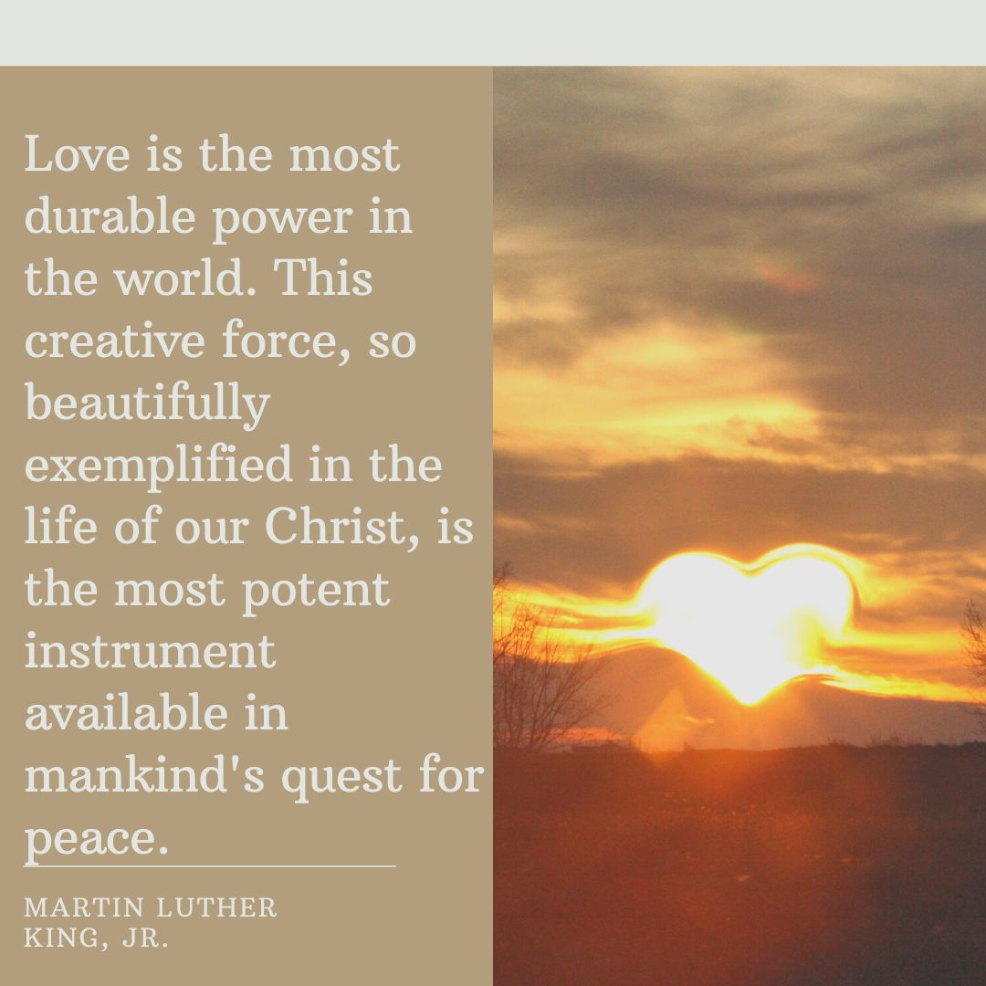 I’m compelled by the idea that love is a “creative force”…something powerful and alive…like a cleansing fire burning through a wood to rid the landscape of decay, or stormy waves crashing into and eroding a rocky cliff to make something new. Love is not passive; rather, it is an active agent working good in the world. And it is the path to peace. When we harness the power of love and use it to help others, we bring God’s kingdom closer. Love allows us to see the humanity in others. Love allows us to humbly admit that we have made a mess of things. Love allows us to empathize with those who have lost loved ones to tragedy, to the extent where we will not rest until we ensure that no one else suffers in the same way. Love allows us to hear the opinions of others and to understand the motivations behind them. Love allows us to do hard things, to have hard conversations, to keep journeying on a hard path. Love allows us to understand that some people need extra help, and that we, as a people, have an obligation to help them.
