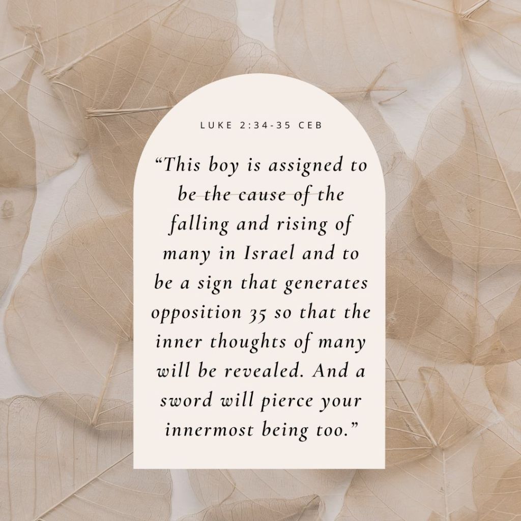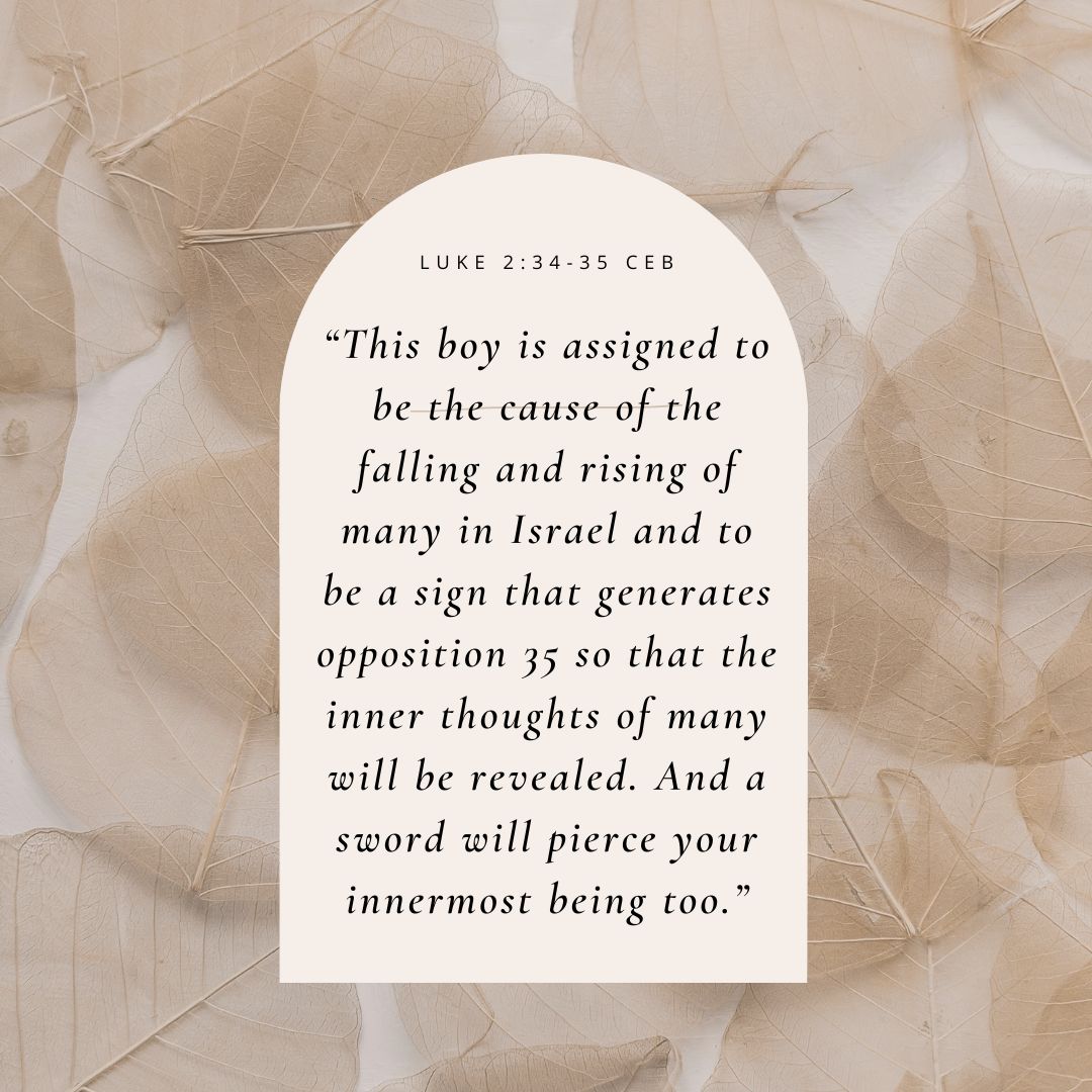 Simeon tells Mary and Joseph that their child will bring salvation….but even more fantastical, it will be a salvation for ALL people–not just the Jews. Hallelujah, right? We are cresting the hilltop–but wait–Simeon isn’t finished yet. Looking straight at Mary he says: