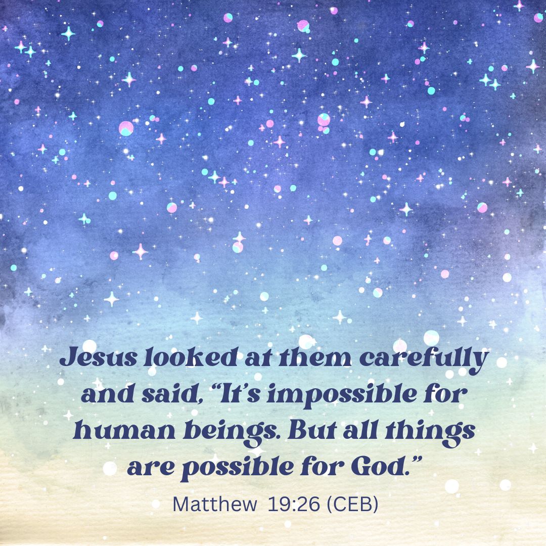 So, what possibility is God speaking into your life this year? What dreams is he whispering into your soul? If you’re like me, I bet some of them are pretty daunting. In my experience, God likes a big project–something I could never accomplish on my own. Like writing a book. Or pursuing a degree. Sponsoring a ministry. Even embarking on a new career path. Possibility can seem impossible, until God steps into the room. As Jesus told his disciples: