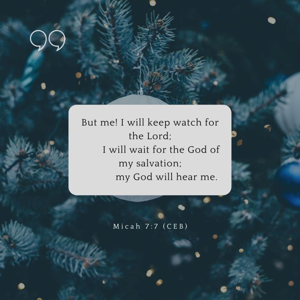 And then there is Micah, who must feel like he’s screaming into the wind, compelling the people of Israel to remember before it’s too late that God only wants these things from them: to be just, to choose love, and to walk in humble obedience with God. But God’s path is a slow one, filled with detours and unexpected pit stops, and the people have no desire for such a seeming waste of time. So Micah sits, pulling his cloak around him, and waits–believing with every fiber of his being that he will see the Lord’s salvation when it comes. Micah stops to watch. He stills himself to listen. He doesn’t check his watch, add to his to-do list, or strategize a shopping plan. He just waits. And hopes. And listens. Do you know what Micah hears in the waiting? He hears the voice of God.
